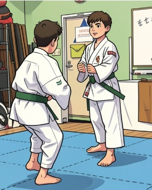 今日の修練に3人の緑帯同士が集まって(10才から75才まで!)、6・5級科目の復習しました。上段逆突の攻撃に対して、体捌きで交わして蹴り返す、3つの法形を。